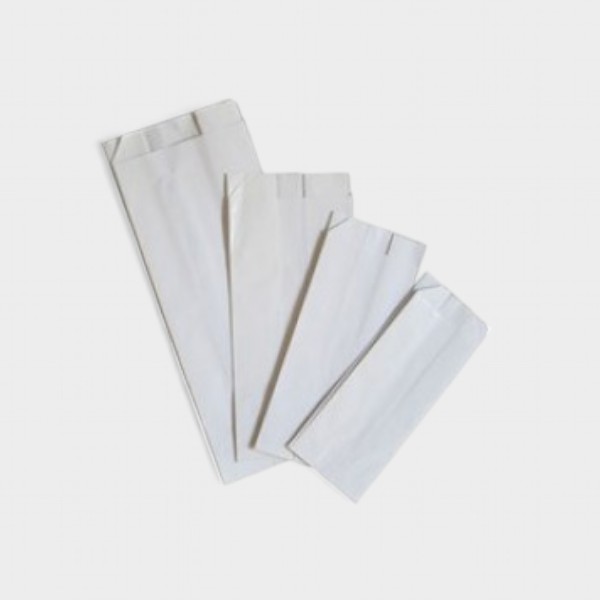 Χάρτινα Σακουλάκια Αδιάβροχα Λευκά. Χρησιμοποιούνται για την συσκευασία & μεταφορά σε σφολιατοειδή, σάντουιτς, πίτες, κουλουράκια, γλυκίσματα κ.α. Διαθέτουν πιέτα για μεγαλύτερο άνοιγμα και έχουν ιδιαίτερη αντοχή στα λιπαρά και ζεστά τρόφιμα. Πλήρως διαμορφωμένο και έτοιμο για χρήση, προκειμένου να παρέχει στον επαγγελματία ταχύτερη τοποθέτηση του προϊόντος. Πιστοποιημένο προϊόν για επαφή με τρόφιμα. Διαθέσιμο σε διάφορα μεγέθη.